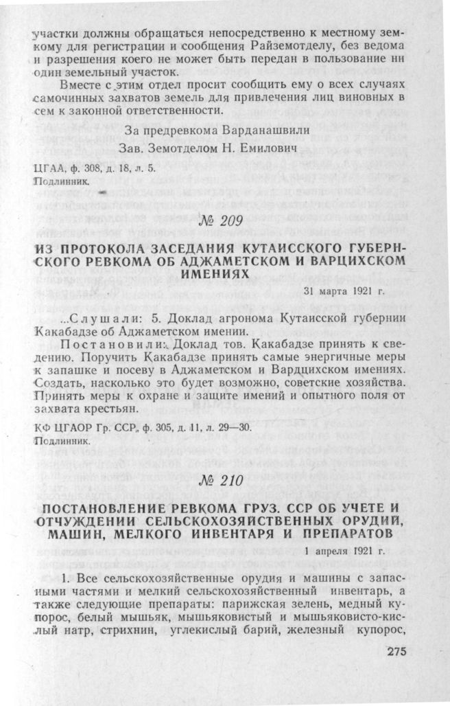 Постановление Ревкома Груз. ССР об учете и отчуждении сельскохозяйственных орудий, машин, мелкого инвентаря и препаратов. 1 апреля 1921 г. // ЦГАОР Гр. ССР, ф. 281, oп. 1, д. 210, л. 24. Типографский экз.