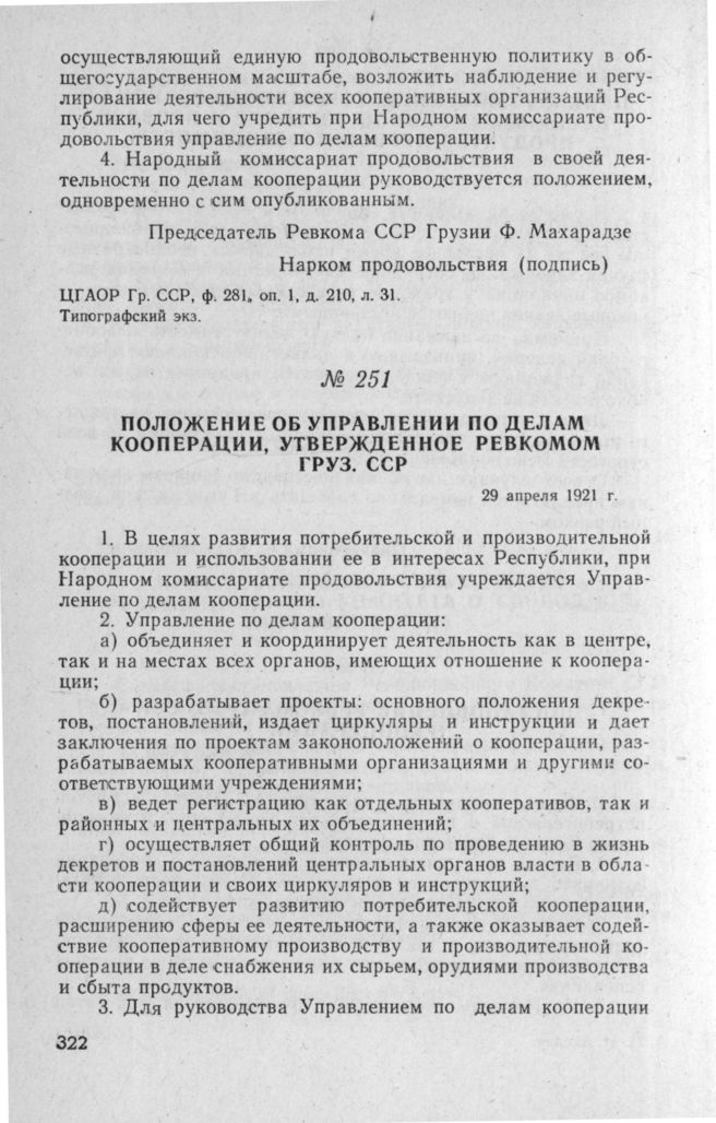 Положение об Управлении по делам кооперации, утвержденное Ревкомом Груз. ССР. 29 апреля 1921 г. // ЦГАОР Гр. ССР, ф. 281, oп. 1, д. 210, л. 32. Типографский экз.