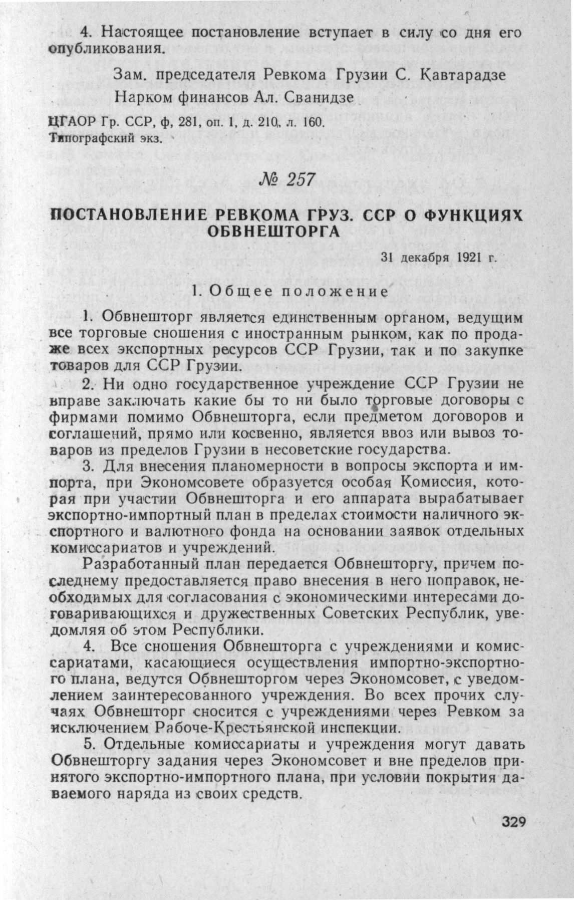 Постановление Ревкома Груз. ССР о функциях Обвнешторга. 31 декабря ...
