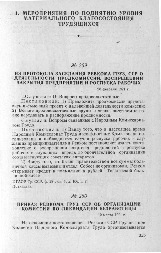 Приказ Ревкома Груз. ССР об организации комиссии по ликвидации безработицы. 12 марта 1921 г. // ЦГАОР Гр. ССР, ф. 281, oп. 1, д. 12, л. 13. Типографский экз.