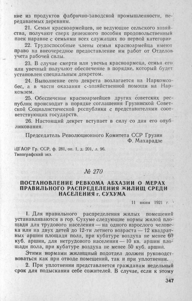 Постановление Ревкома Абхазии о мерах правильного распределения жилищ среди населения г. Сухума. 11 июня 1921 г. // ЦГАА, ф. 352, д. 16, л. 35. Типографский экз.
