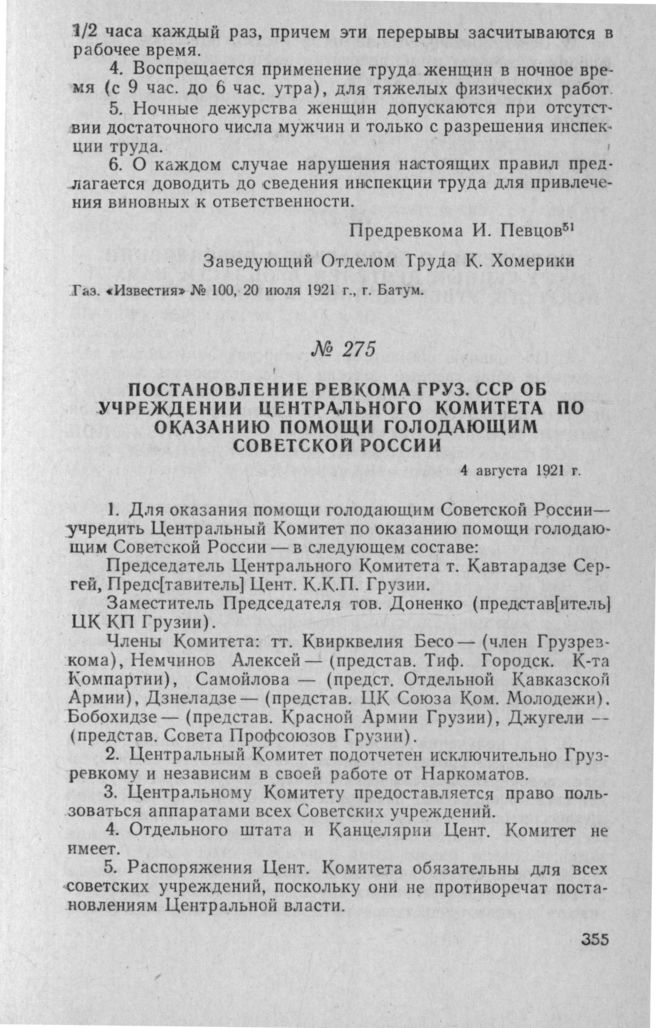 Постановление Ревкома Груз. ССР об учреждении Центрального Комитета по оказанию помощи голодающим Советской России. 4 августа 1921 г. // ЦГАОР Гр. ССР, ф. 281, oп. 1, д. 210, л. 90. Типографский экз.