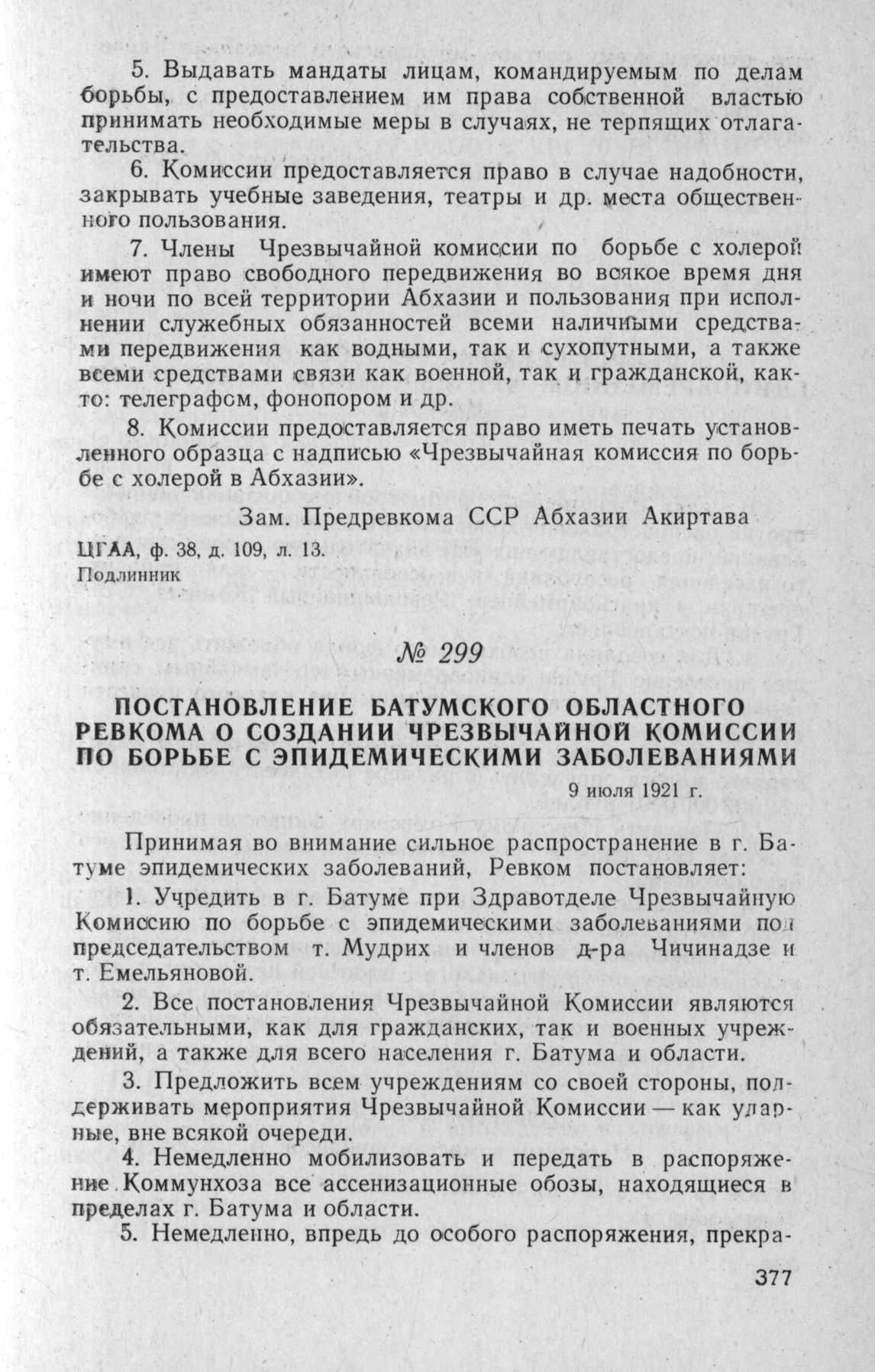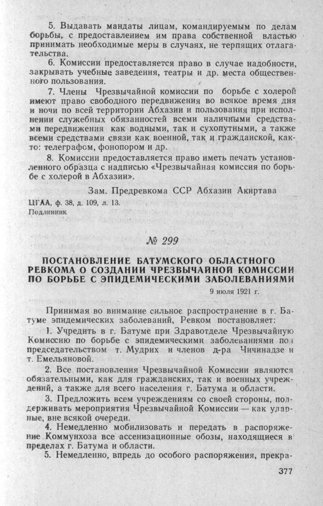 Постановление Батумского Областного Ревкома о создании Чрезвычайной Комиссии по борьбе с эпидемическими заболеваниями. 9 июля 1921 г. // ЦГА Адж. АССР, ф. Р—1, д. 1, л. 59. Подлинник.