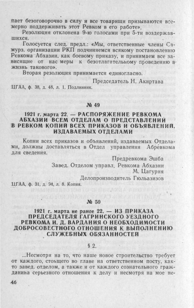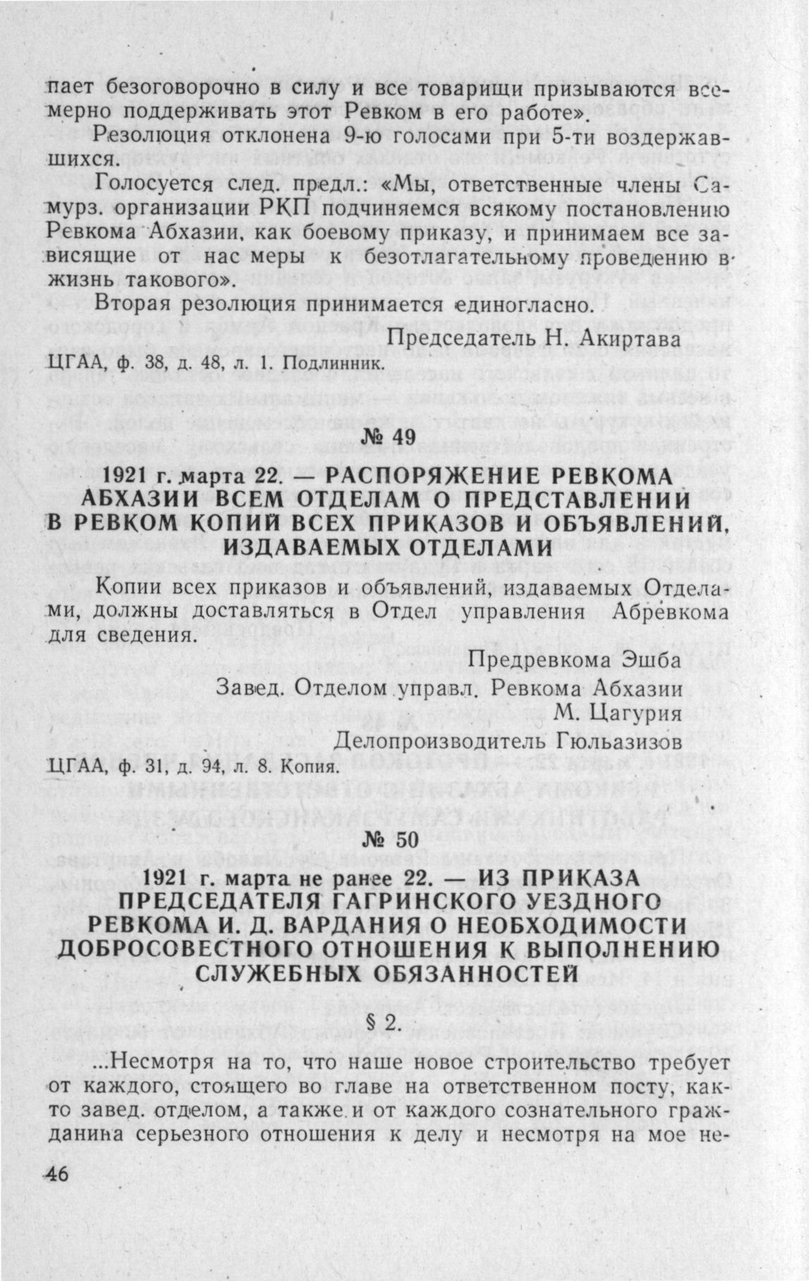 Из приказа председателя Гагринского уездного Ревкома И.Д. Вардания о необходимости добросовестного отношения к выполнению служебных обязанностей. Не ранее 22 марта 1921 г.