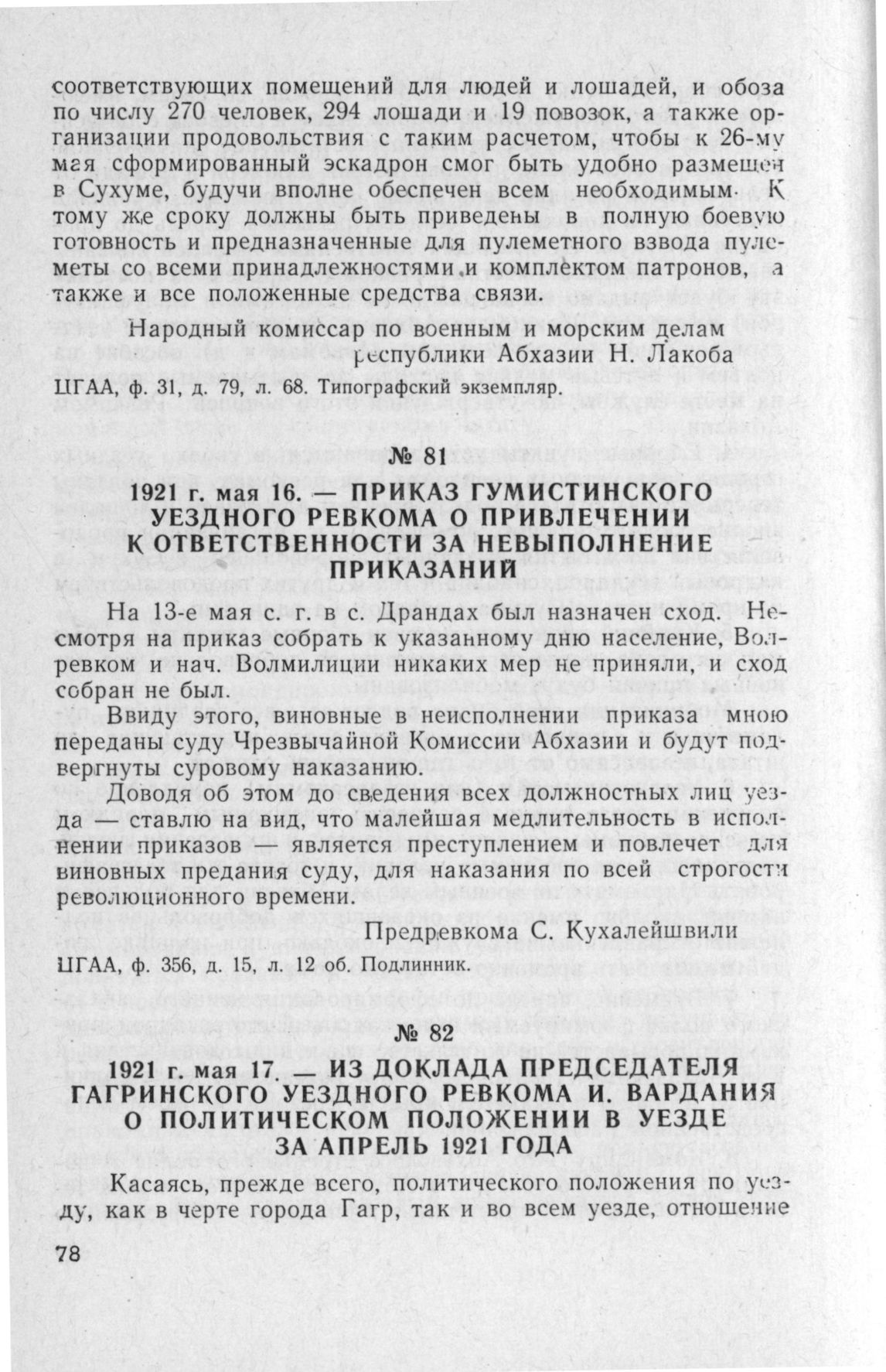 Из доклада председателя Гагринского уездного Ревкома И. Вардания о политическом положении в уезде за апрель 1921 года. 17 мая 1921 г. // ЦГАА, ф. 308, д. 1, ч. 1, лл. 451—455. Подлинник.