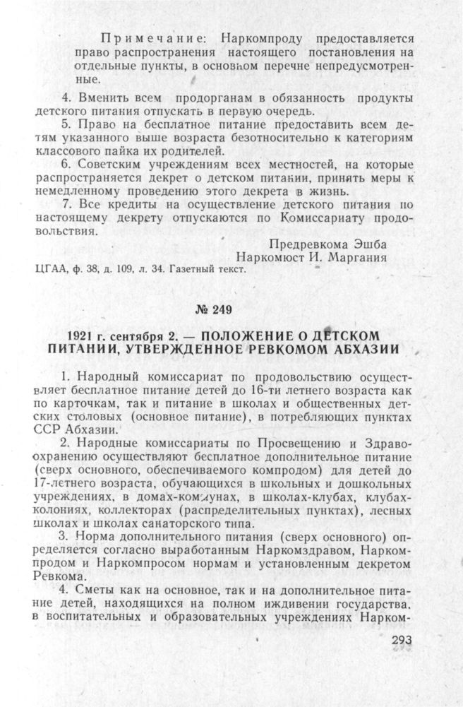 Положение о детском питании, утвержденное Ревкомом Абхазии. 2 сентября 1921 г. // ЦГАА, ф. 38, д. 109, л. 34. Газетный текст.