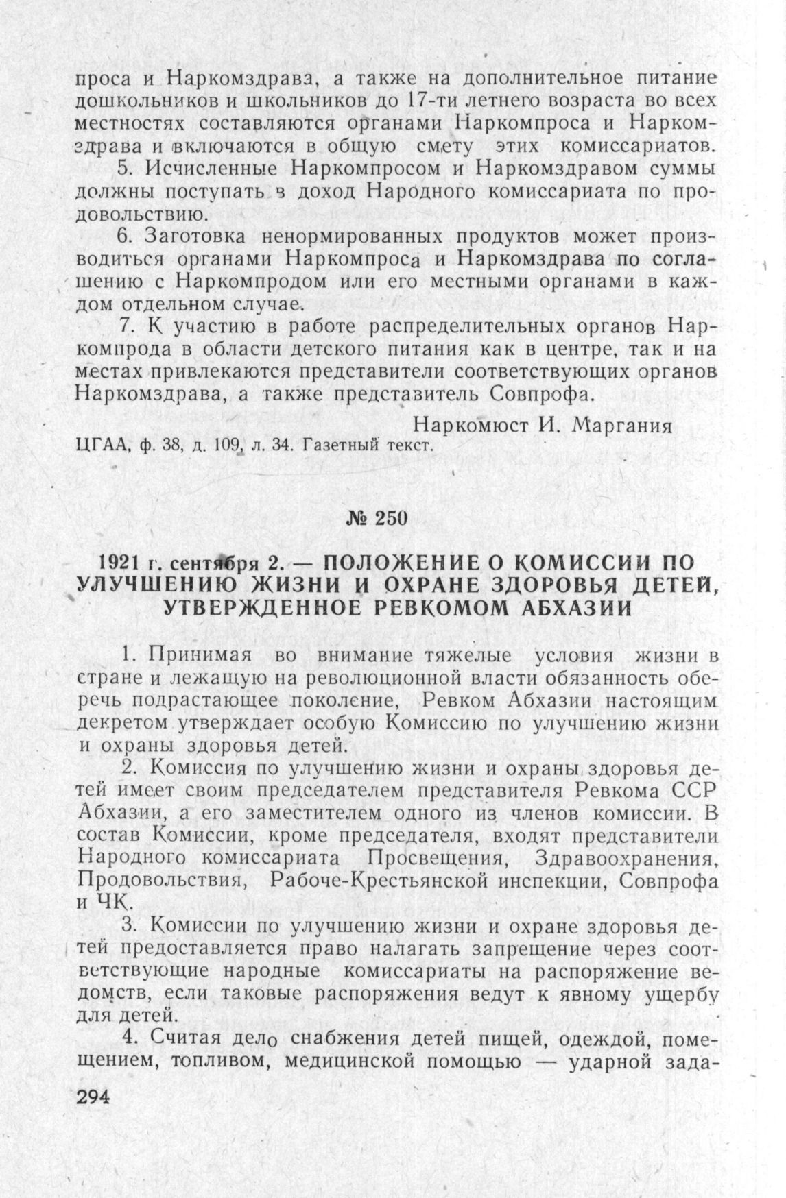Положение о Комиссии по улучшению жизни и охране здоровья детей, утвержденное Ревкомом Абхазии. 2 сентября 1921 г. // ЦГАА, ф . 38, д. 109, л. 34. Газетный текст.