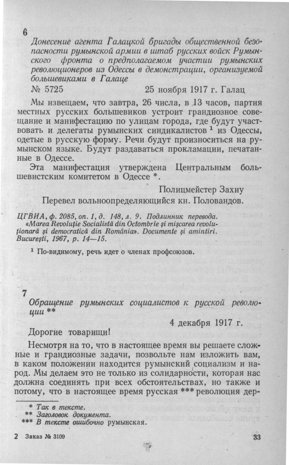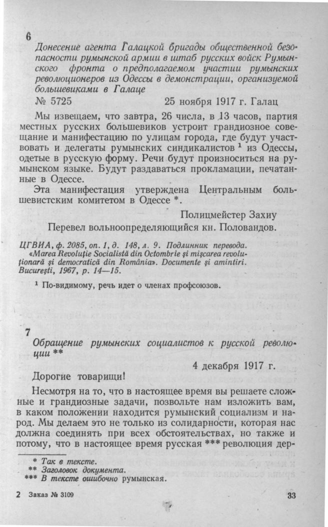 Донесение агента Галацкой бригады общественной безопасности румынской армии в штаб русских войск Румынского фронта о предполагаемом участии румынских революционеров из Одессы в демонстрации, организуемой большевиками в Галаце. 25 ноября 1917 г. Галац // ЦГВИА, ф. 2085, oп. 1, д. 148, л. 9. Подлинник перевода. «Marea Revoluţie Socialistă din Octombrie şi mişcarea revolu ţionară şi democratică din România». Documente şi amintiri. Bucureşti, 1967, p. 14—15.