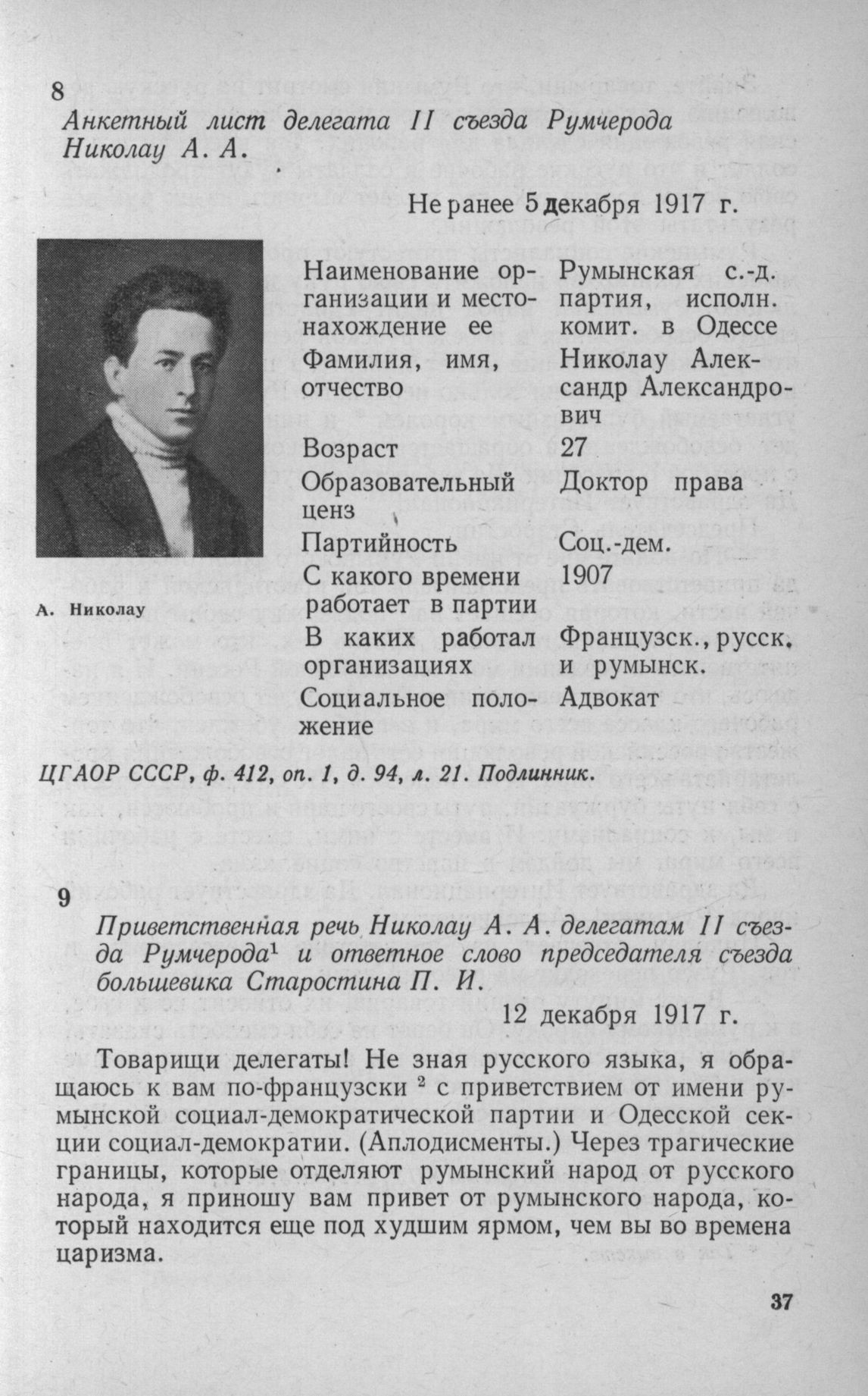 Приветственная речь Николау А.А. делегатам II съезда Румчерода и ответное слово председателя съезда большевика Старостина П.И. 12 декабря 1917 г. // Партийный архив Одесского обкома КПУ, ф. 2, oп. 3, д. 41, л. 55. Стенографический отчет.