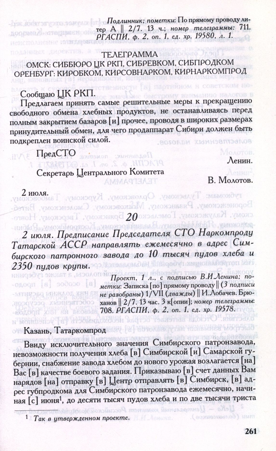 2 июля. Предписание Председателя СТО Наркомпроду Татарской АССР направлять ежемесячно в адрес Симбирского патронного завода до 10 тысяч пудов хлеба и 2350 пудов крупы // Проект, 1 л., с подписью В.И. Ленина; пометки: Записка по прямому проводу || (3 подписи не разобраны) 1 /VII (дважды) || И.Лобачев. Брюханов || 2/7. 13 час. 3 копии; номер телеграммы: 708. РГАСПИ, ф. 2, oп. 1, ед. хр. 19578.