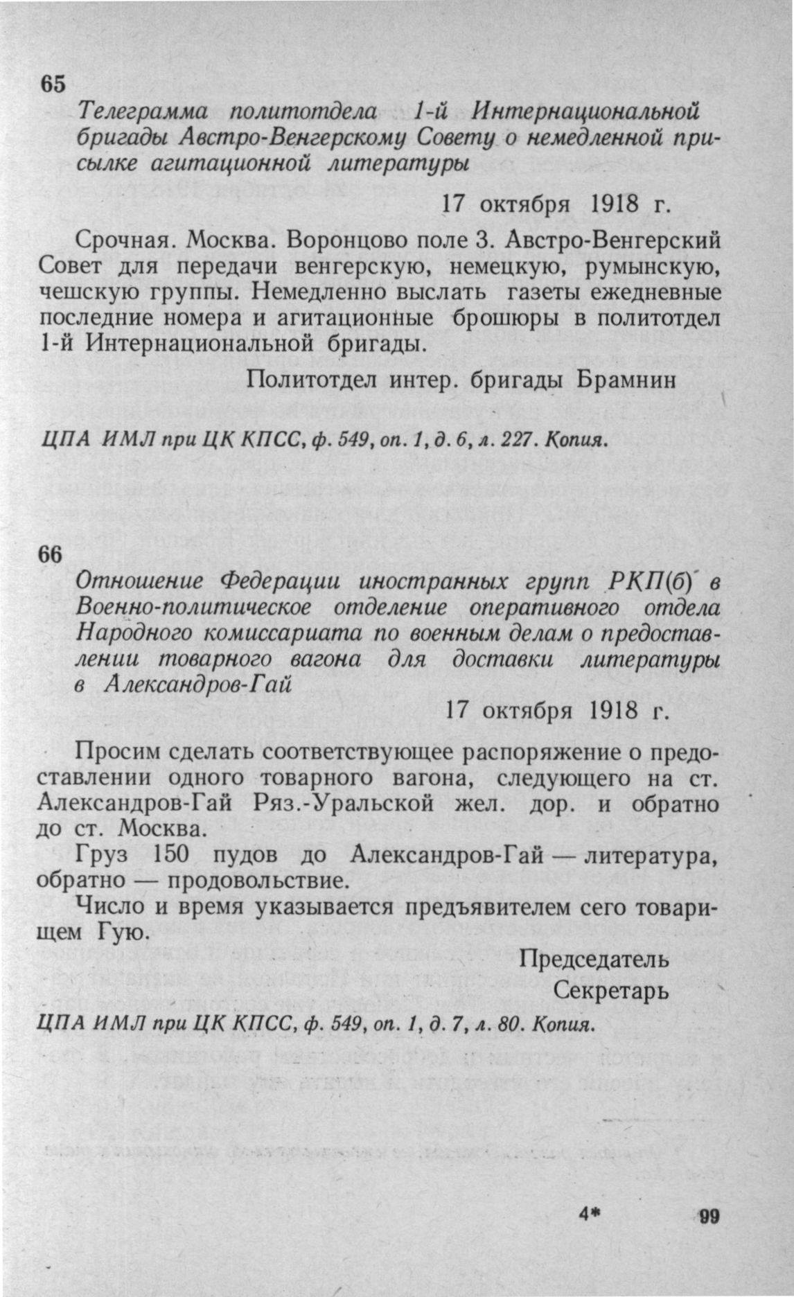 Отношение Федерации иностранных групп РКП(б) в Военно-политическое отделение оперативного отдела Народного комиссариата по военным делам о предоставлении товарного вагона для доставки литературы в Александров-Гай. 17 октября 1918 г. // ЦПА ИМЛ при ЦК КПСС, ф. 549, oп. 1, д. 7, л. 80. Копия.
