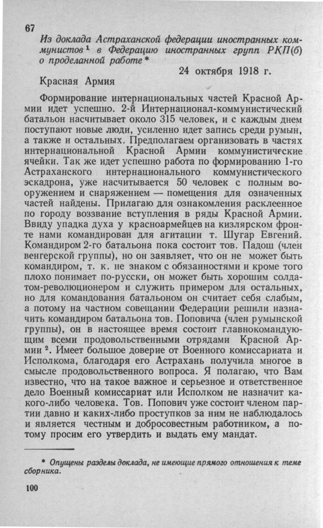 Из доклада Астраханской федерации иностранных коммунистов в Федерацию иностранных групп РКП(б) о проделанной работе. 24 октября 1918 г. // ЦПА ИМЛ при ЦК КПСС, ф. 549, oп. 1, д. 6, лл. 11—13. Подлинник.