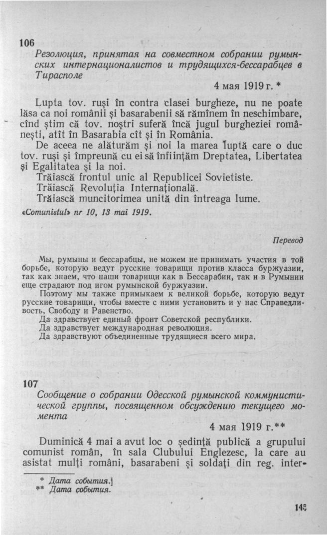 Сообщение о собрании Одесской румынской коммунистической группы, посвященном обсуждению текущего момента. 4 мая 1919 г. // «Comunistul» nr 7, 6 mai 1919.