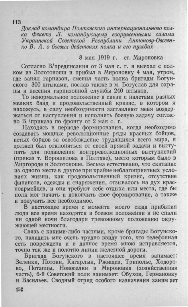 Доклад командира Полтавского интернационального полка Фекетэ Л. командующему вооруженными силами Украинской Советской Республики Антонову-Овсеенко В.А. о боевых действиях полка и его нуждах. 8 мая 1919 г.
