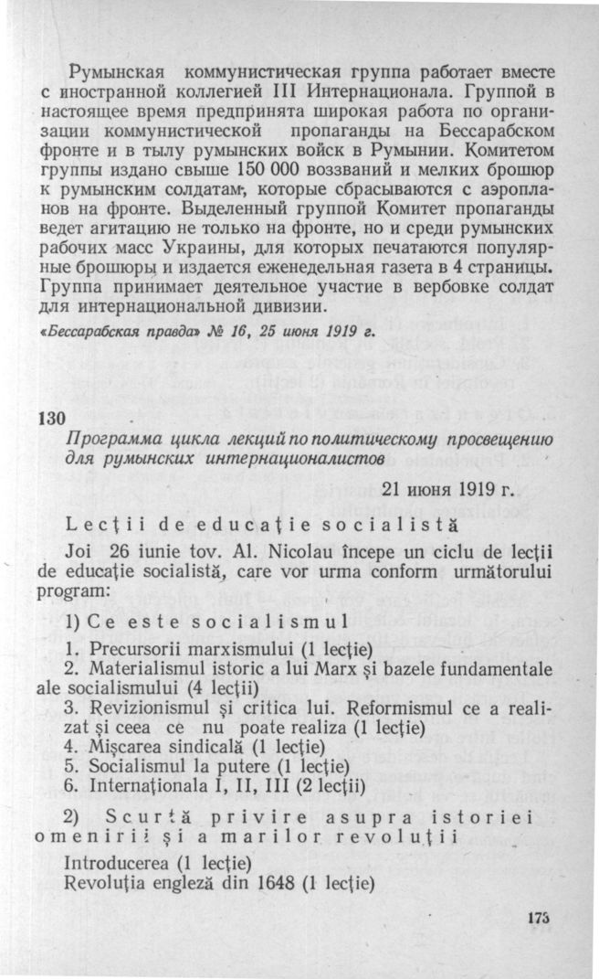 Сообщения о деятельности Комитета пропаганды Одесской румынской коммунистической группы. 18—25 июня 1919 г. Сообщение 3 // «Бессарабская правда» № 16, 25 июня 1919 г.