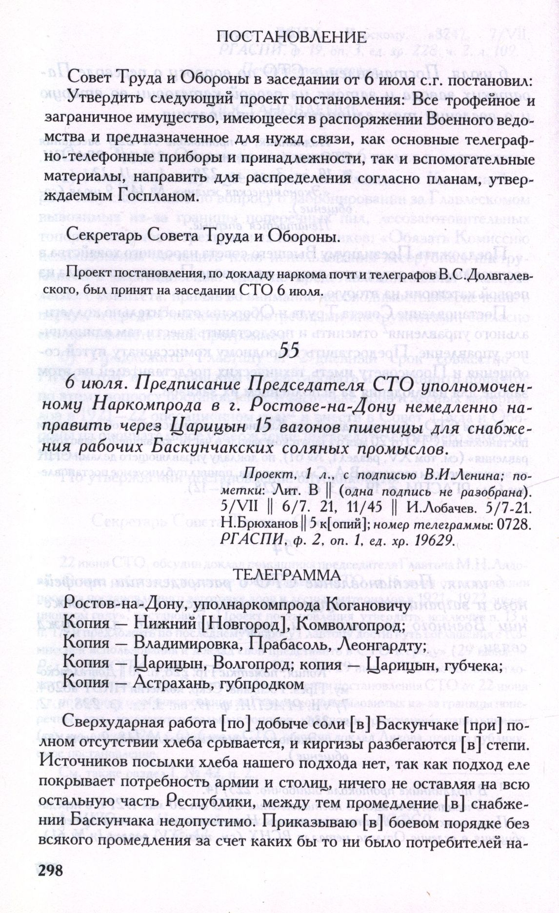 6 июля. Предписание Председателя СТО уполномоченному Наркомпрода в г. Ростове-на-Дону немедленно направить через Царицын 15 вагонов пшеницы для снабжения рабочих Баскунчакских соляных промыслов // Проект, 1 л., с подписью В.И. Ленина; пометки: Лит. В || (одна подпись не разобрана). 5/VII || 6/7. 21, 11/45 || И.Лобачев. 5/7-21. Н.Брюханов || 5 копий; номер телеграммы: 0728. РГАСПИ, ф. 2, oп. 1, ед. хр. 19629.