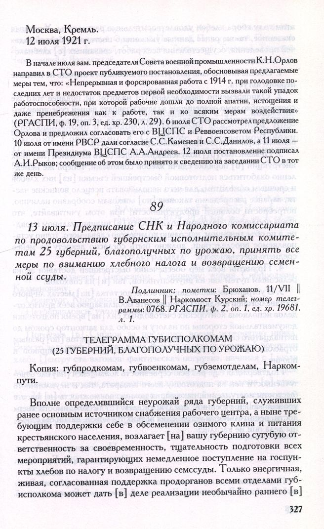 13 июля. Предписание СНК и Народного комиссариата по продовольствию губернским исполнительным комитетам 25 губерний, благополучных по урожаю, принять все меры по взиманию хлебного налога и возвращению семенной ссуды // Подлинник; пометки: Брюханов. 11/VII || В.Аванесов || Наркомюст Курский; номер телеграммы: 0768. РГАСПИ, ф. 2, oп. 1, ед. хр. 19681, л. 1.