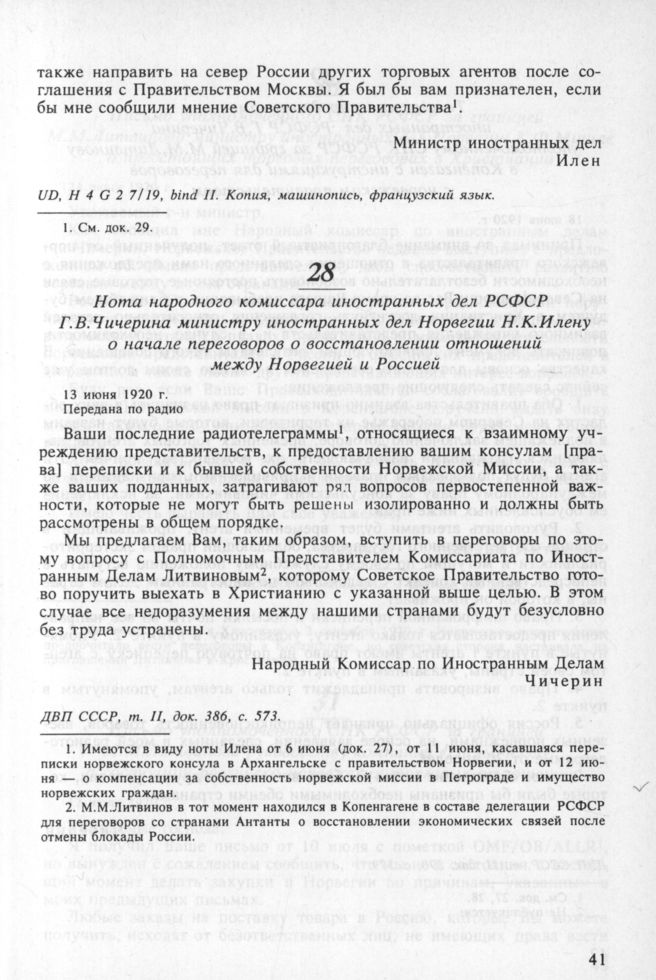 Нота народного комиссара иностранных дел РСФСР Г.В. Чичерина министру иностранных дел Норвегии Н.К. Илену о начале переговоров о восстановлении отношений между Норвегией и Россией. 13 июня 1920 г.