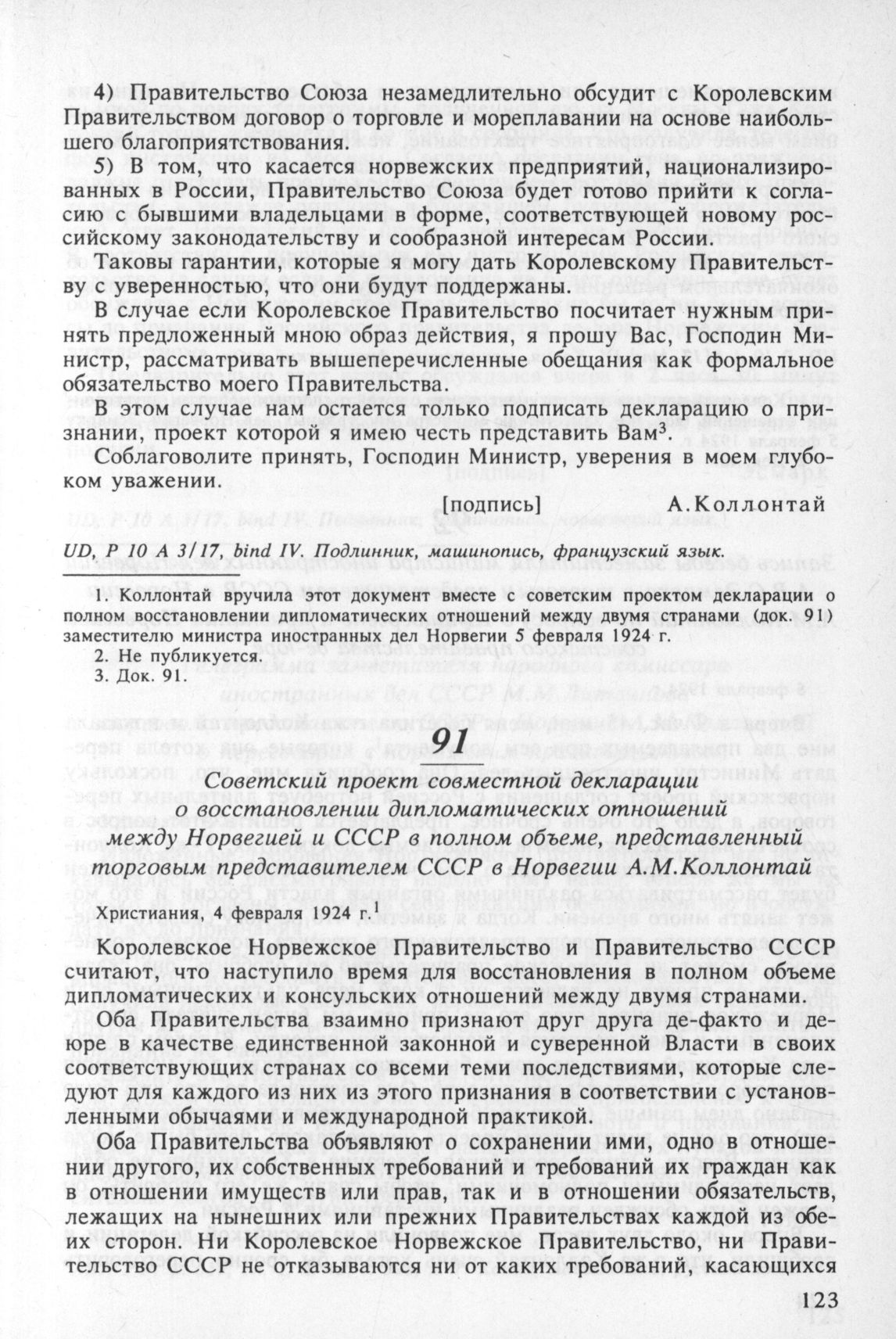Советский проект совместной декларации о восстановлении дипломатических отношений между Норвегией и СССР в полном объеме, представленный торговым представителем СССР в Норвегии А.М. Коллонтай. Христиания, 4 февраля 1924 г. // UD, Р 10 А 3/17, bind IV. Копия, машинопись, французский язык.