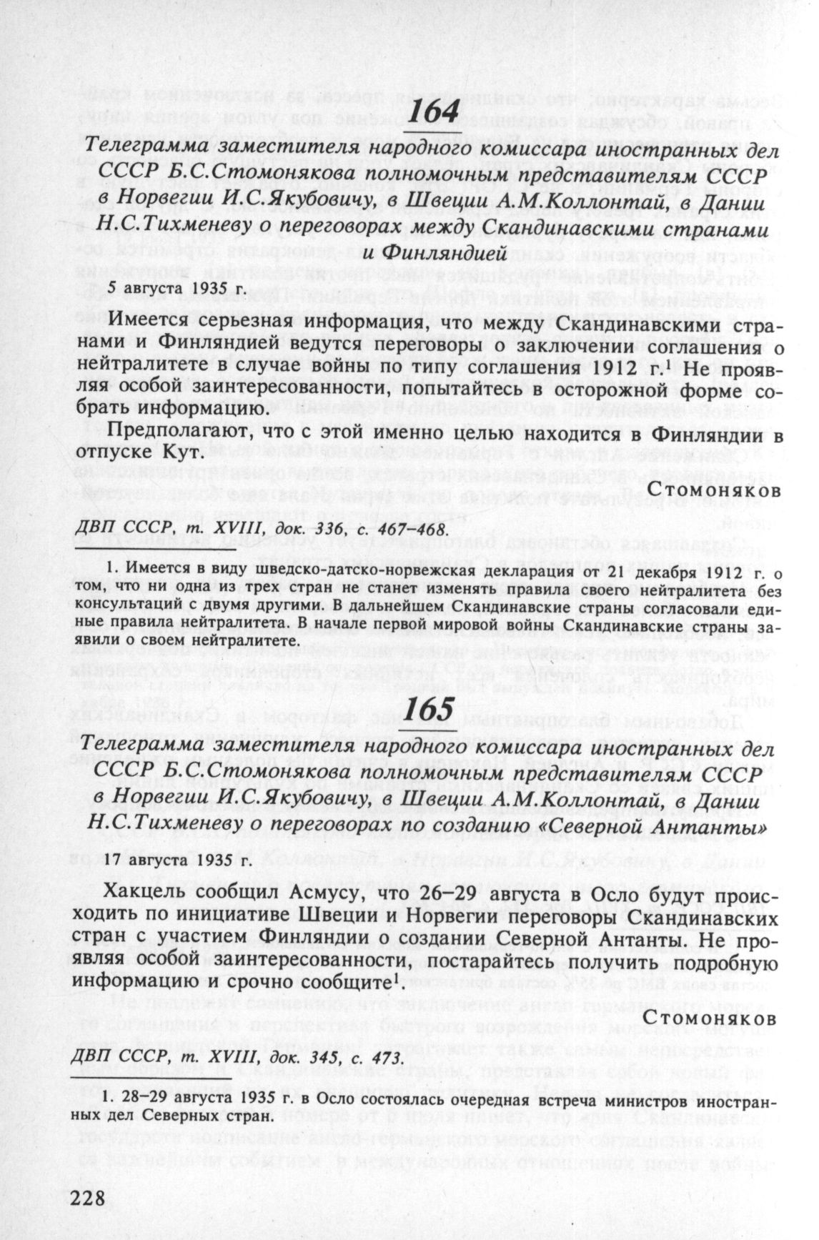 Телеграмма заместителя народного комиссара иностранных дел СССР Б.С. Стомонякова полномочным представителям СССР в Норвегии И.С. Якубовичу, в Швеции А.М. Коллонтай, в Дании Н.С. Тихменеву о переговорах между Скандинавскими странами и Финляндией. 5 августа 1935 г. // ДВП СССР, Т. XVIII, док. 336, С. 467-468.