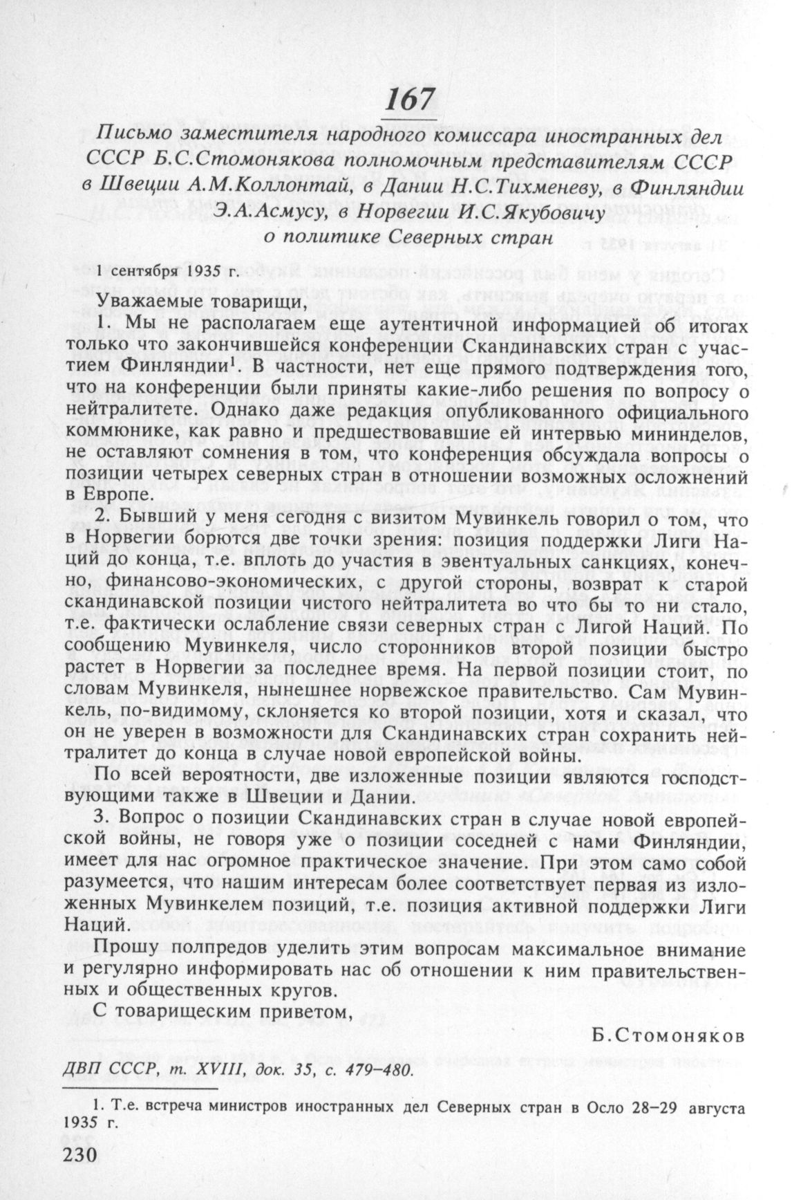 Письмо заместителя народного комиссара иностранных дел СССР Б.С. Стомонякова полномочным представителям СССР в Швеции А.М. Коллонтай, в Дании Н.С. Тихменеву, в Финляндии Э.А. Асмусу, в Норвегии И.С. Якубовичу о политике Северных стран. 1 сентября 1935 г. // ДВП СССР, Т. XVIII, док. 35, С. 479-480.