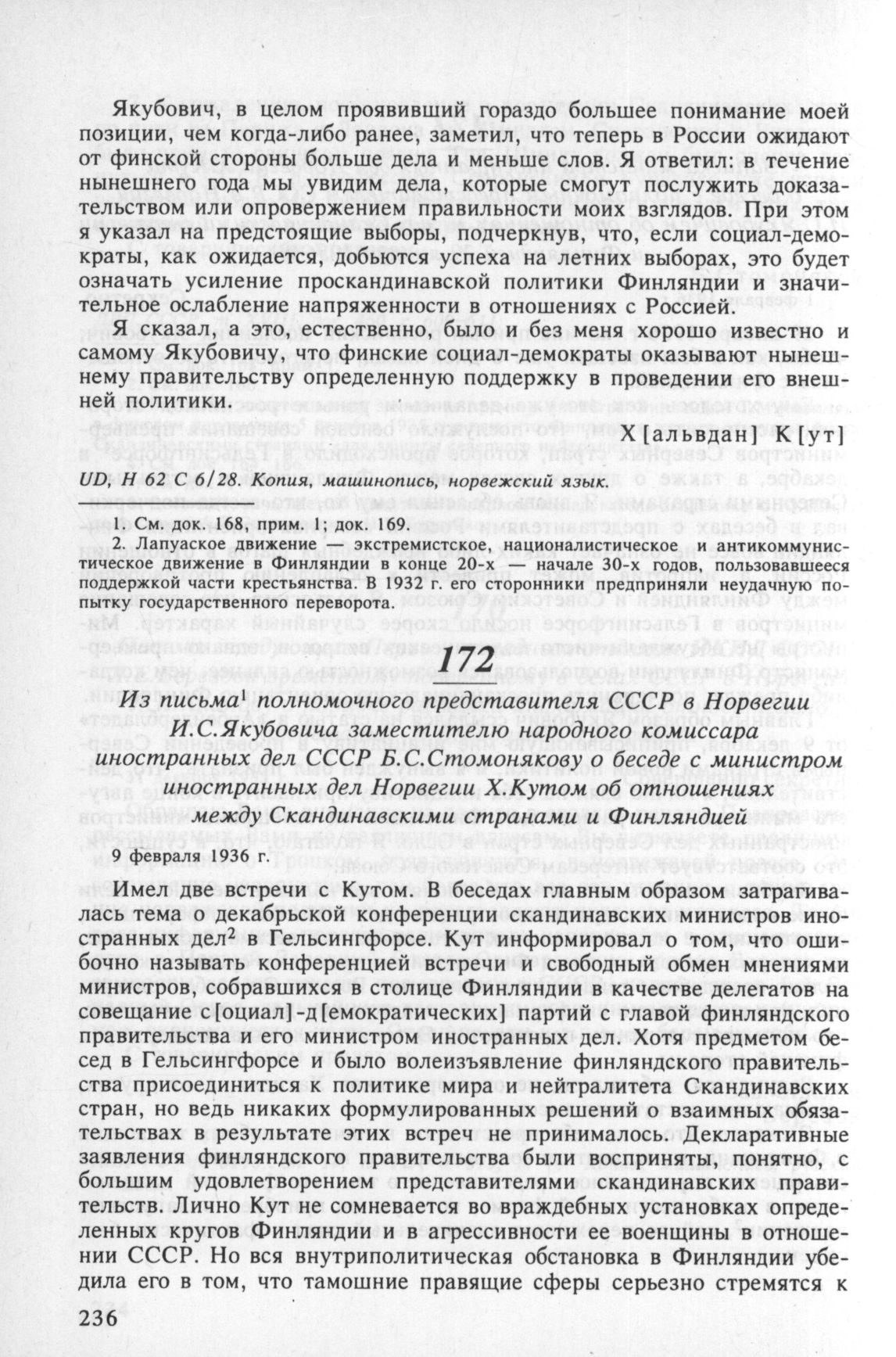 Из письма полномочного представителя СССР в Норвегии И.С. Якубовича заместителю народного комиссара иностранных дел СССР Б.С. Стомонякову о беседе с министром иностранных дел Норвегии Х. Кутом об отношениях между Скандинавскими странами и Финляндией. 9 февраля 1936 г. // ДВП СССР, Т. XIX, док. 39, С. 67-68.