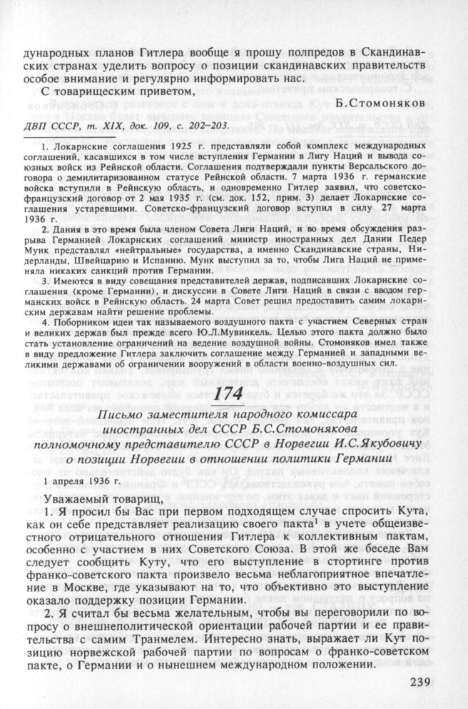 Письмо заместителя народного комиссара иностранных дел СССР Б.С. Стомонякова полномочному представителю СССР в Норвегии И.С. Якубовичу о позиции Норвегии в отношении политики Германии. 1 апреля 1936 г. // ДВП СССР, Т. XIX, док. 111, С. 205.