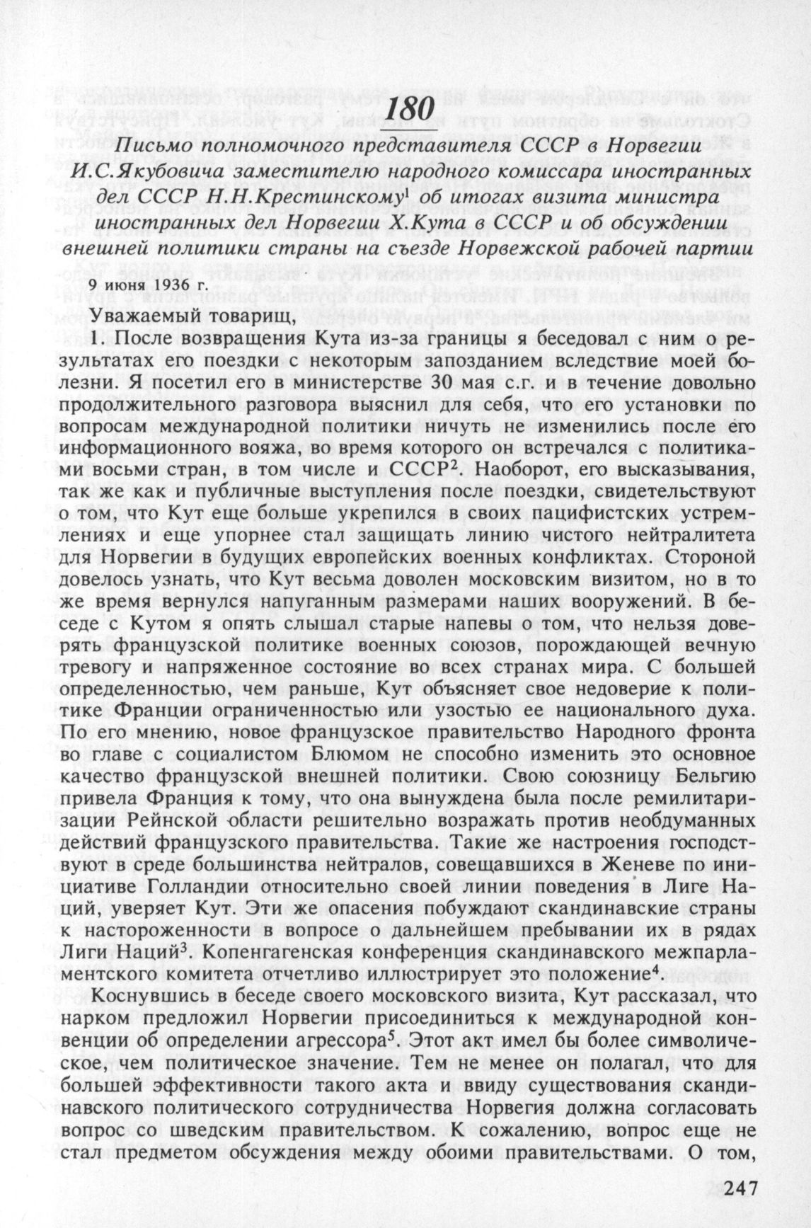 Письмо полномочного представителя СССР в Норвегии И.С. Якубовича заместителю народного комиссара иностранных дел СССР Н.Н. Крестинскому об итогах визита министра иностранных дел Норвегии Х. Кута в СССР и об обсуждении внешней политики страны на съезде Норвежской рабочей партии. 9 июня 1936 г. // ДВП СССР, Т. XIX, док. 184, С. 298-302.