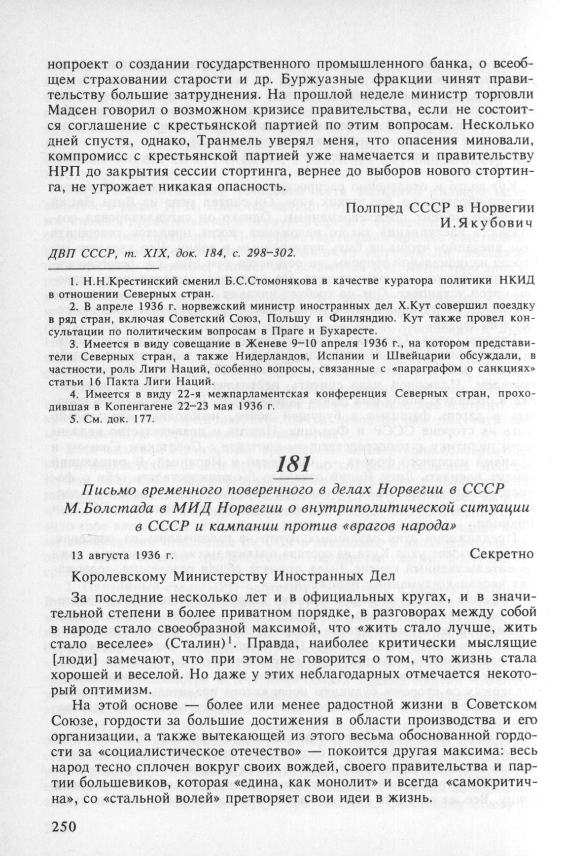Письмо временного поверенного в делах Норвегии в СССР М. Болстада в МИД Норвегии о внутриполитической ситуации в СССР и кампании против «врагов народа». 13 августа 1936 г.