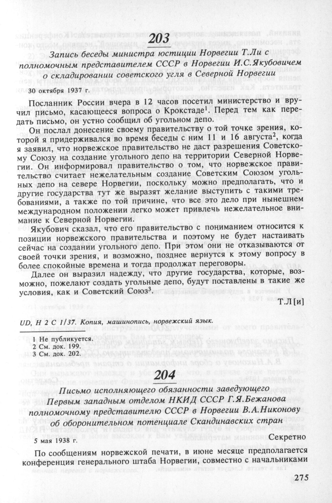 Запись беседы министра юстиции Норвегии Т. Ли с полномочным представителем СССР в Норвегии И.С. Якубовичем о складировании советского угля в Северной Норвегии. 30 октября 1937 г. // UD, Н 2 С 1/37. Копия, машинопись, норвежский язык.