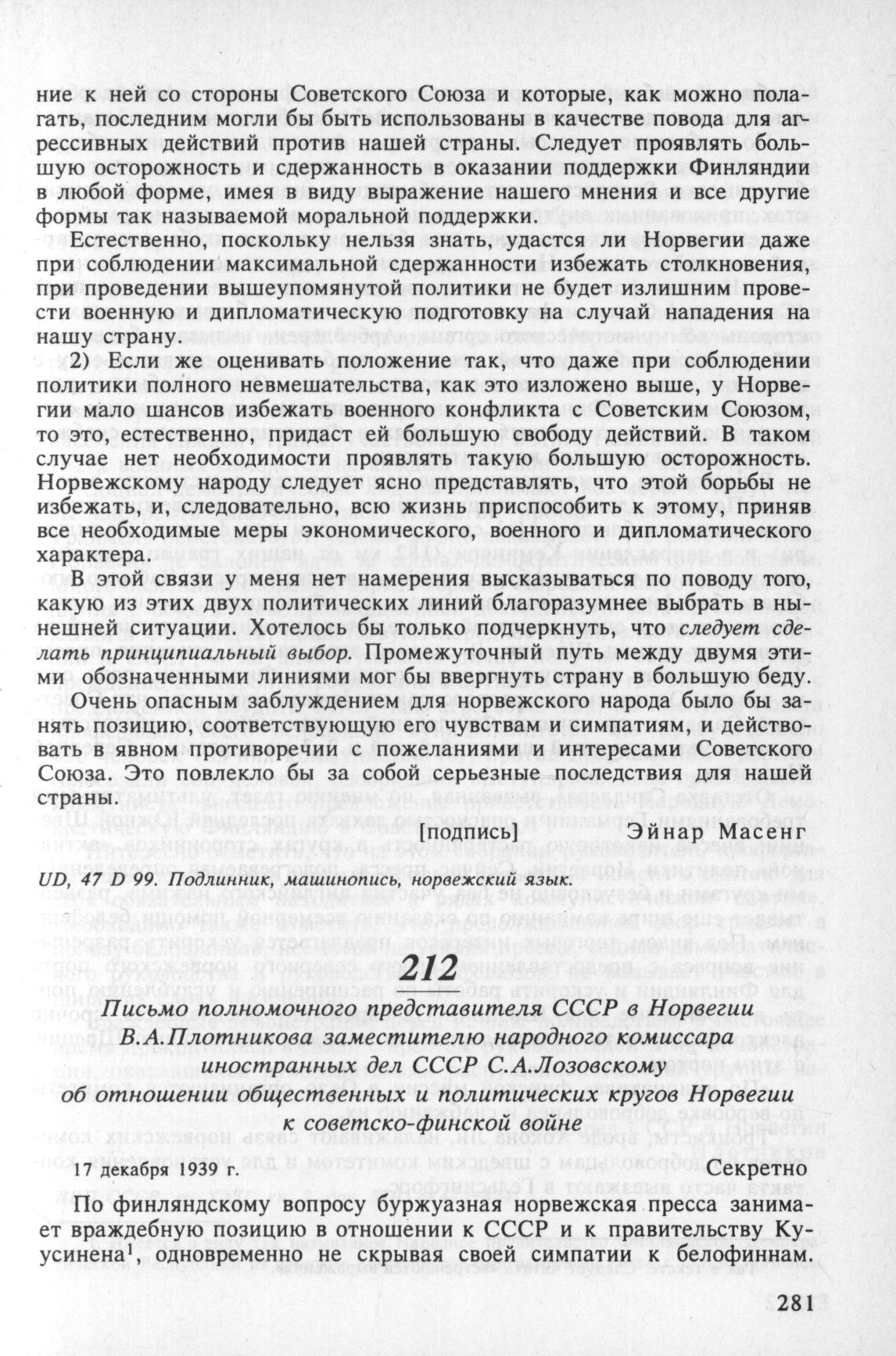 Письмо полномочного представителя СССР в Норвегии В.А. Плотникова заместителю народного комиссара иностранных дел СССР С.А. Лозовскому об отношении общественных и политических кругов Норвегии к советско-финской войне. 17 декабря 1939 г. // ДВП СССР, Т. XXII, кн. 2, док. 870, С. 422-424.