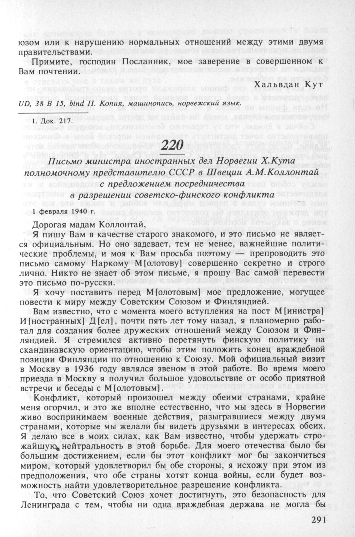 Письмо министра иностранных дел Норвегии Х. Кута полномочному представителю СССР в Швеции А.М. Коллонтай с предложением посредничества в разрешении советско-финского конфликта. 1 февраля 1940 г. // АВП РФ, ф. 06, oп. 2, п. 25, д. 318, л. 14-16. Копия, машинопись, современный перевод с норвежского.