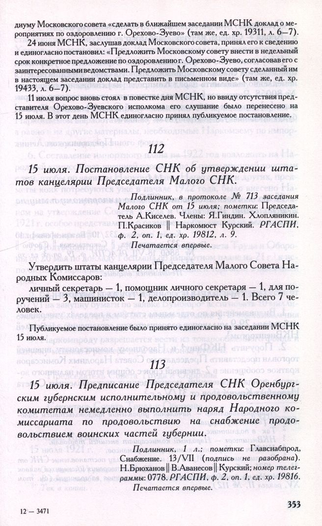 15 июля. Предписание Председателя СНК Оренбургским губернским исполнительному и продовольственному комитетам немедленно выполнить наряд Народного комиссариата по продовольствию на снабжение продовольствием воинских частей губернии // Подлинник, 1 л.; пометки: Главснабпрод, Снабжение. 13/VII (подпись не разобрана). Н.Брюханов || В.Аванесов || Курский; номер телеграммы: 0778. РГАСПИ, ф. 2, oп. 1, ед. хр. 19816. Печатается впервые.