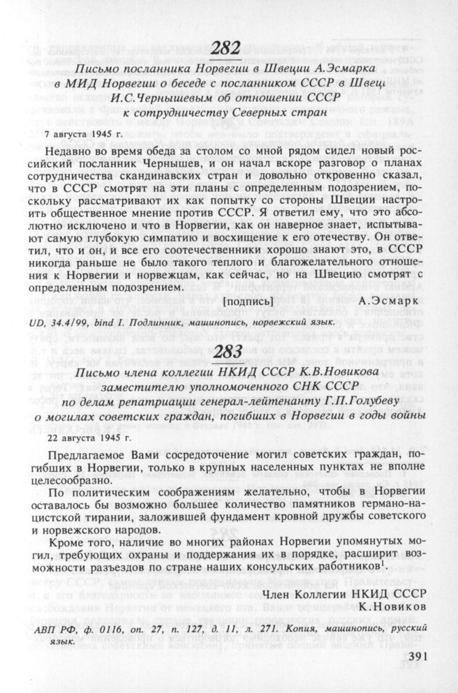 Письмо посланника Норвегии в Швеции А. Эсмарка в МИД Норвегии о беседе с посланником СССР в Швеции И.С. Чернышевым об отношении СССР к сотрудничеству Северных стран. 7 августа 1945 г. // UD, 34.4/99, bind I. Подлинник, машинопись, норвежский язык.
