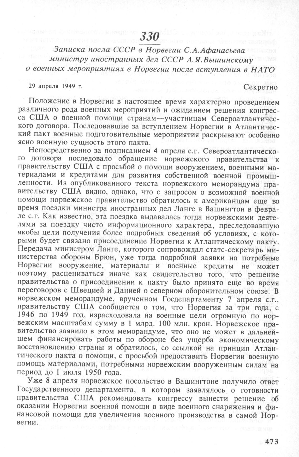 Записка посла СССР в Норвегии С.А. Афанасьева министру иностранных дел СССР А.Я. Вышинскому о военных мероприятиях в Норвегии после вступления в НАТО. 2 9 апреля 1949 г. // АВП РФ, ф. 0116, oп. 38, п. 150, д. 2, л. 1-3. Подлинник, машинопись, русский язык.