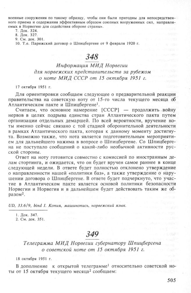 Информация МИД Норвегии для норвежских представительств за рубежом о ноте МИД СССР от 15 октября 1951 г. 17 октября 1951 г. // UD, 33.6/9, bind I. Копия, машинопись, норвежский язык.