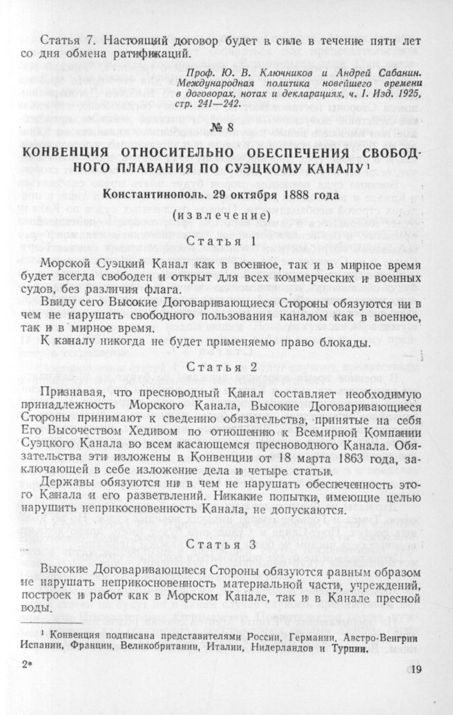 Конвенция относительно обеспечения свободного плавания по Суэцкому каналу. Константинополь. 29 октября 1888 года // Сборник действующих трактатов, конвенций и соглашений, заключенных Россией с другими государствами, т. II. Изд. 2, СПБ, 1906, стр. 135—140.