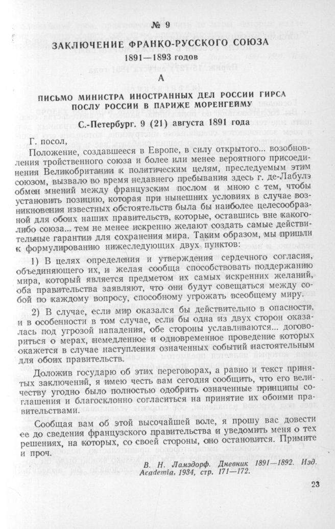 Письмо министра иностранных дел России Гирса послу России в Париже Моренгейму. С.-Петербург. 9 (21) августа 1891 года // В. Н. Ламздорф. Дневник 1891—1892. Изд. Academia, 1934, стр. 171 — 172.