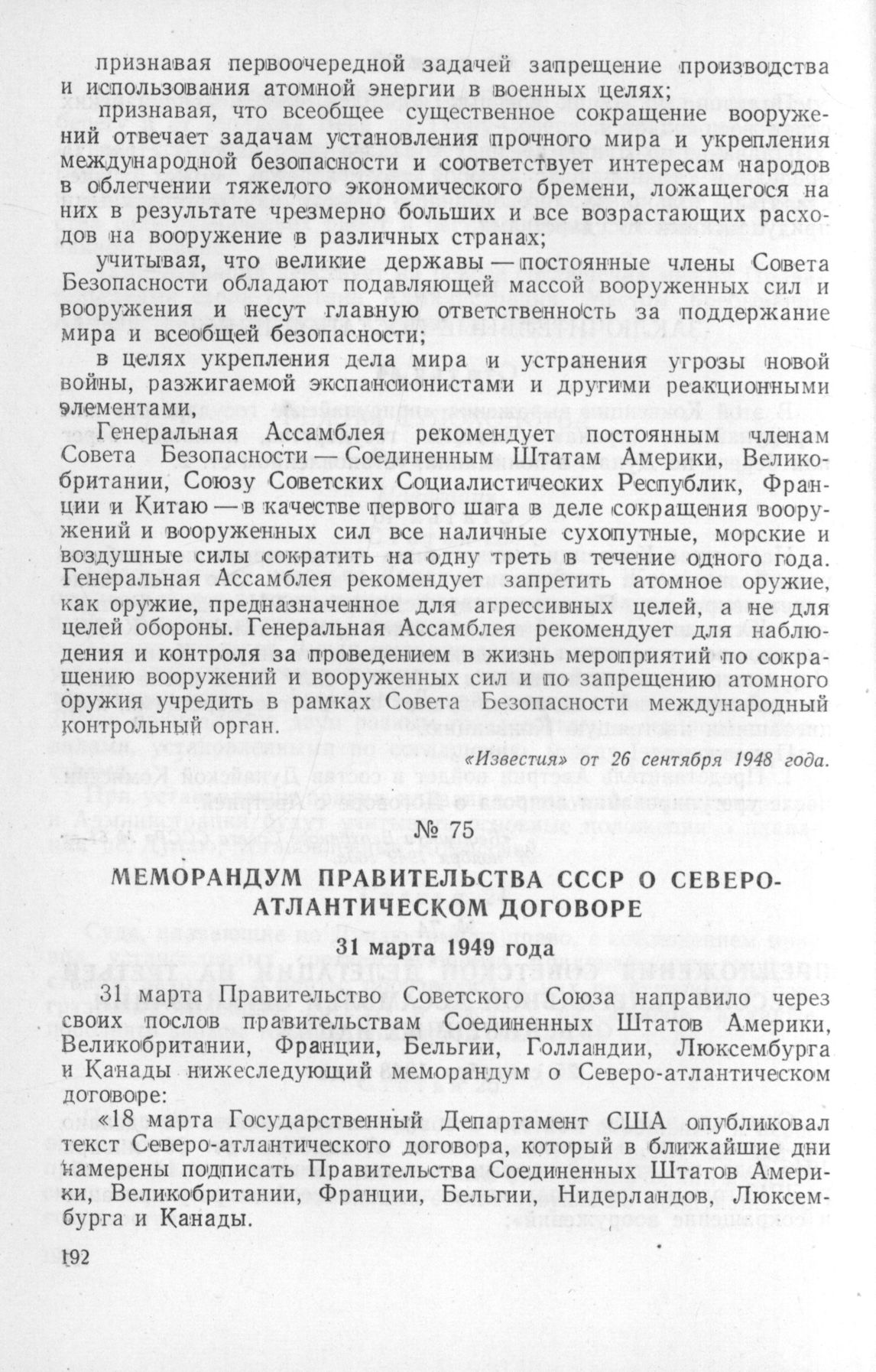 Меморандум правительства СССР о Северо-атлантическом договоре. 31 марта 1949 года // «Известия» от 1 апреля 1949 года.