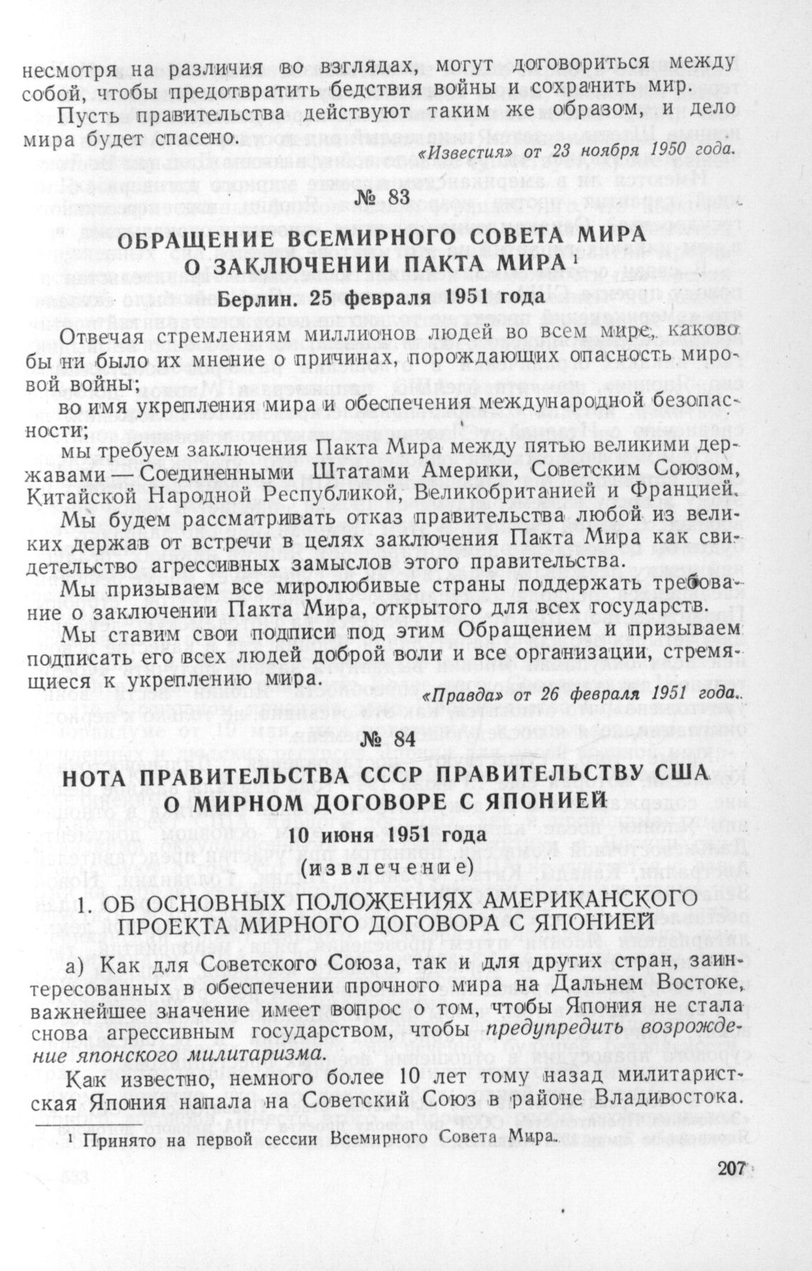 Обращение Всемирного Совета Мира о заключении Пакта Мира. Берлин. 25 февраля 1951 года // «Известия» от 26 февраля 1951 года.