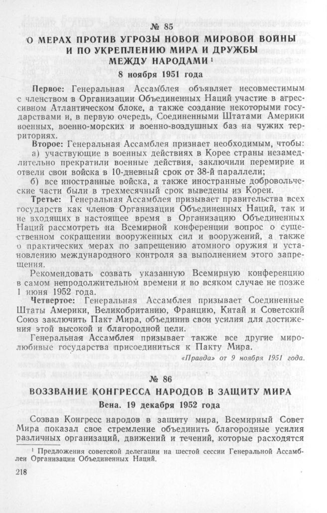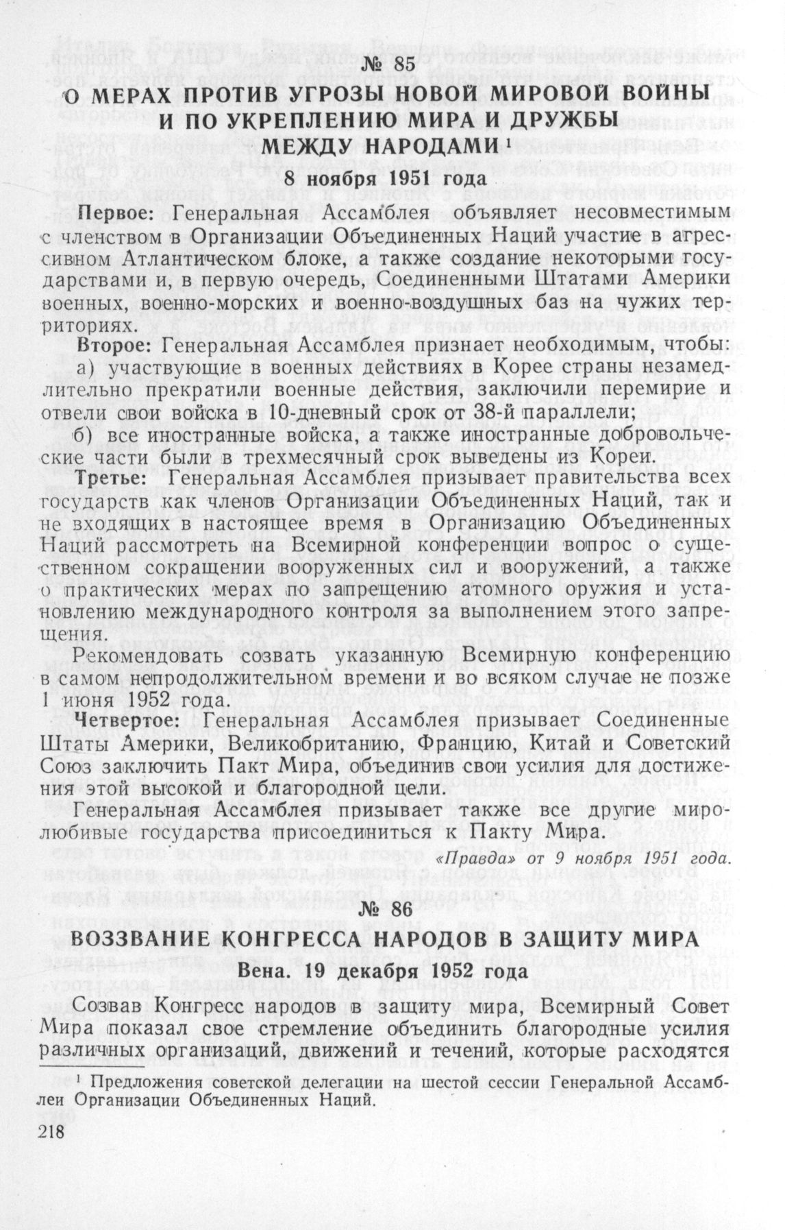 О мерах против угрозы новой мировой войны и по укреплению мира и дружбы между народами. 8 ноября 1951 года // «Правда» от 9 ноября 1951 года.
