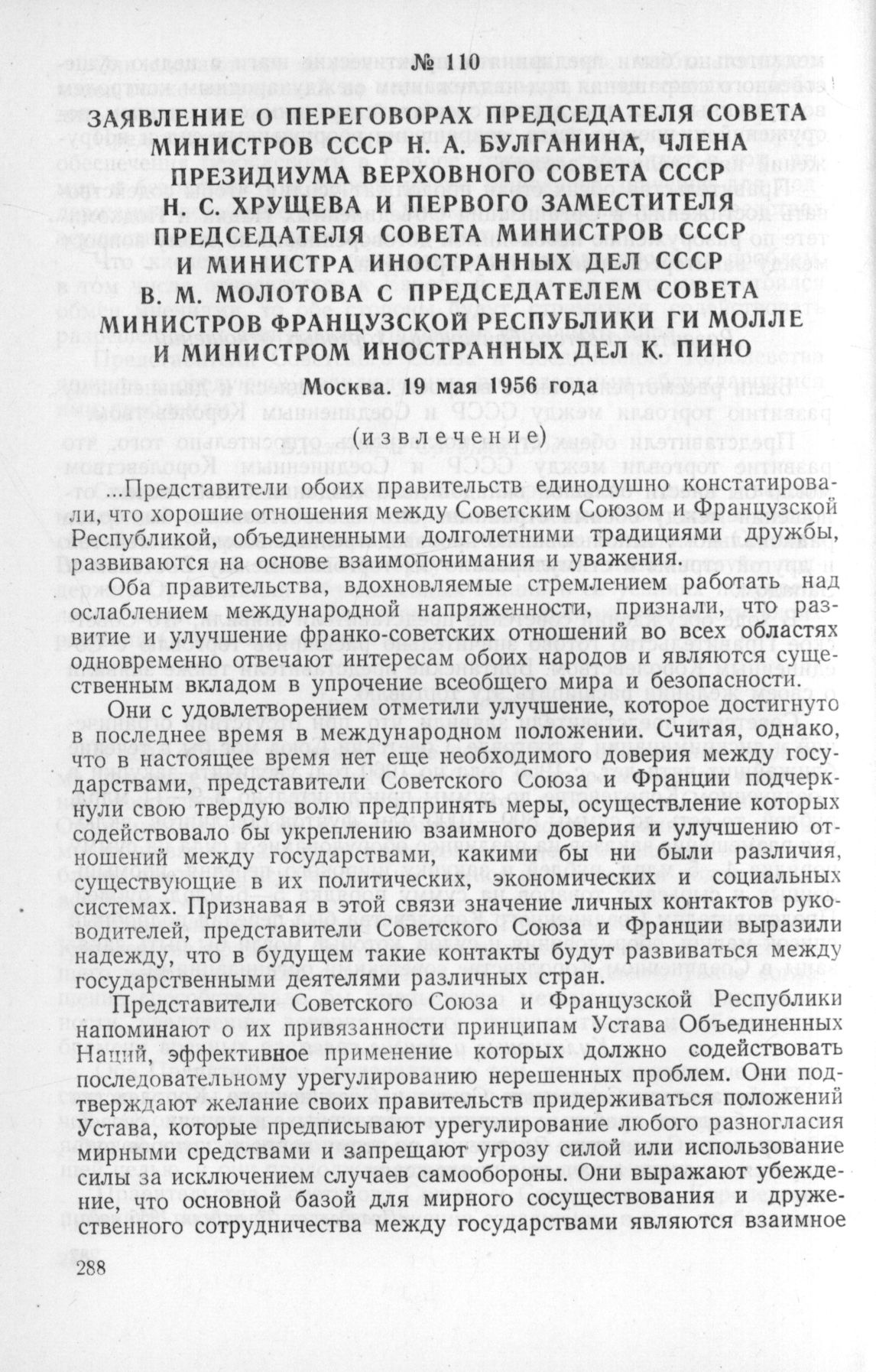 Заявление о переговорах Председателя Совета Министров СССР Н. А, Булганина, Члена Президиума Верховного Совета СССР Н. С. Хрущева и Первого Заместителя Председателя Совета Министров СССР и Министра Иностранных Дел СССР В. М. Молотова с Председателем Совета Министров Французской Республики Ги Молле и Министром Иностранных Дел К. Пино. Москва. 19 мая 1956 года