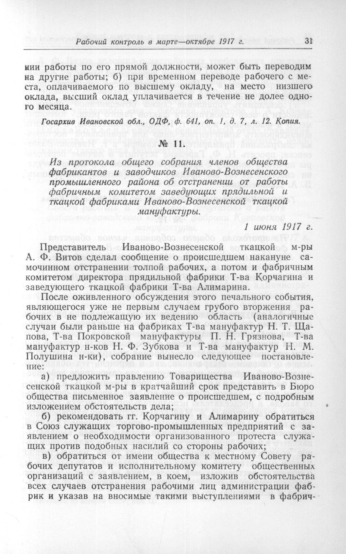 Из протокола общего собрания членов общества фабрикантов и заводчиков Иваново-Вознесенского промышленного района об отстранении от работы фабричным комитетом заведующих прядильной и ткацкой фабриками Иваново-Вознесенской ткацкой мануфактуры. 1 июня 1917 г. // Госархив Ивановской обл., ОДФ, ф. 7, oп. 1, д. 156, л. 20. Копия.