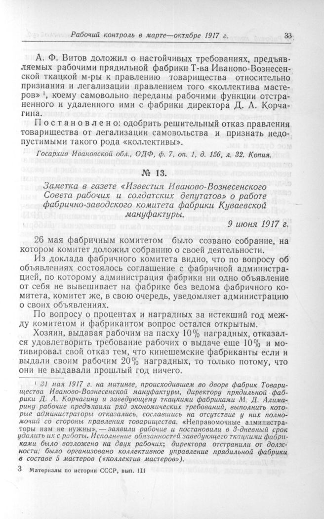 Материалы по истории СССР. Вып. III. Рабочий контроль и национализация крупной промышленности в Иваново-Вознесенской губернии. — М.: Изд-во АН СССР, 1956.