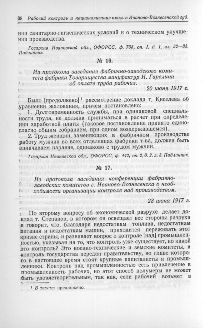 Из протокола заседания фабрично-заводского комитета фабрики Товарищества мануфактур И. Гарелина об оплате труда рабочих. 20 июня 1917 г. // Госархив Ивановской обл., ОФОРСС, ф. 442, oп. 2, д. 2, л. 3. Подлинник.