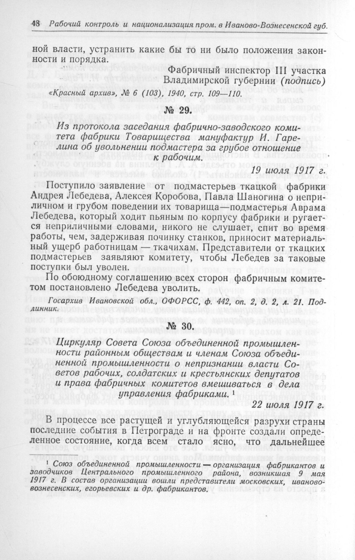 Из протокола заседания фабрично-заводского комитета фабрики Товарищества мануфактур И. Гарелина об увольнении подмастера за грубое отношение к рабочим. 19 июля 1917 г. // Госархив Ивановской обл., ОФОРСС, ф. 442, oп. 2, д. 2, л. 21. Подлинник.