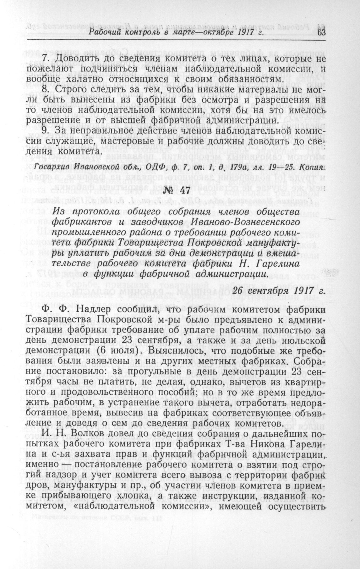 Из протокола общего собрания членов общества фабрикантов и заводчиков Иваново-Вознесенского промышленного района о требовании рабочего комитета фабрики Товарищества Покровской мануфактуры уплатить рабочим за дни демонстрации и вмешательстве рабочего комитета фабрики Н. Гарелина в функции фабричной администрации. 26 сентября 1917 г. // Госархив Ивановской обл., ОДФ, ф. 7, oп. 1, д. 156, л. 170а. Копия.