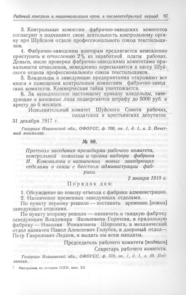 Протокол заседания президиума рабочего комитета, контрольной комиссии и органа надзора фабрики И. Коновалова о назначении новых заведующих отделами в связи с бегством администрации фабрики. 2 января 1918 г. // Госархив Ивановской обл., ОФОРСС, ф. 709, oп. 1, д. 1, л. 49. Подлинник.