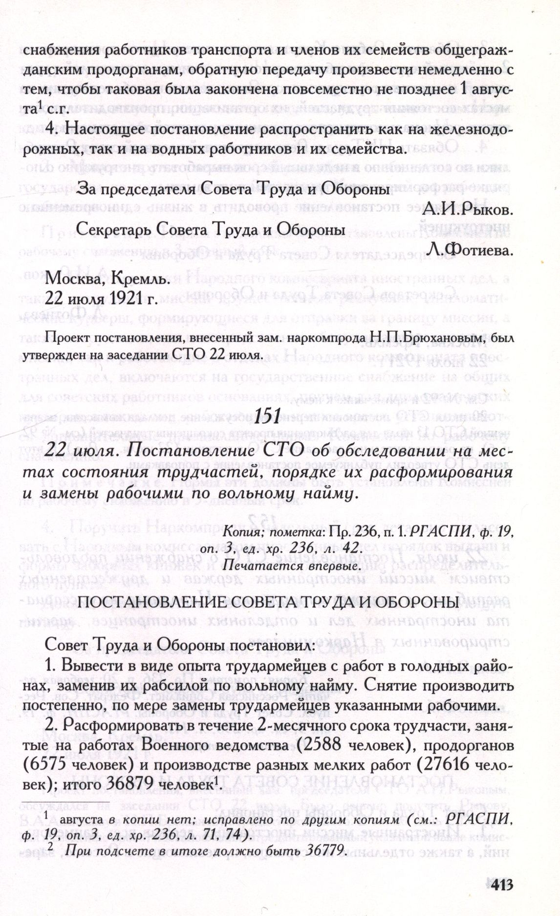 22 июля. Постановление СТО об обследовании на местах состояния трудчастей, порядке их расформирования и замены рабочими по вольному найму // Копия; пометка: Пр. 236, п. 1. РГАСПИ, ф. 19, oп. 3, ед. хр. 236, л. 42. Печатается впервые.