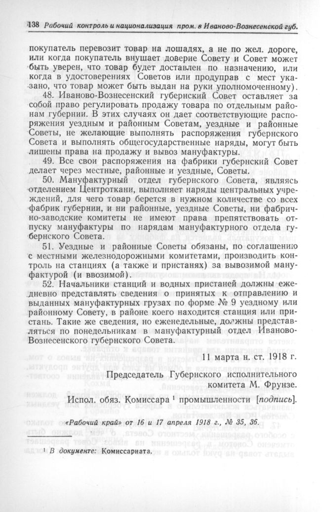 Материалы по истории СССР. Вып. III. Рабочий контроль и национализация крупной промышленности в Иваново-Вознесенской губернии. — М.: Изд-во АН СССР, 1956.